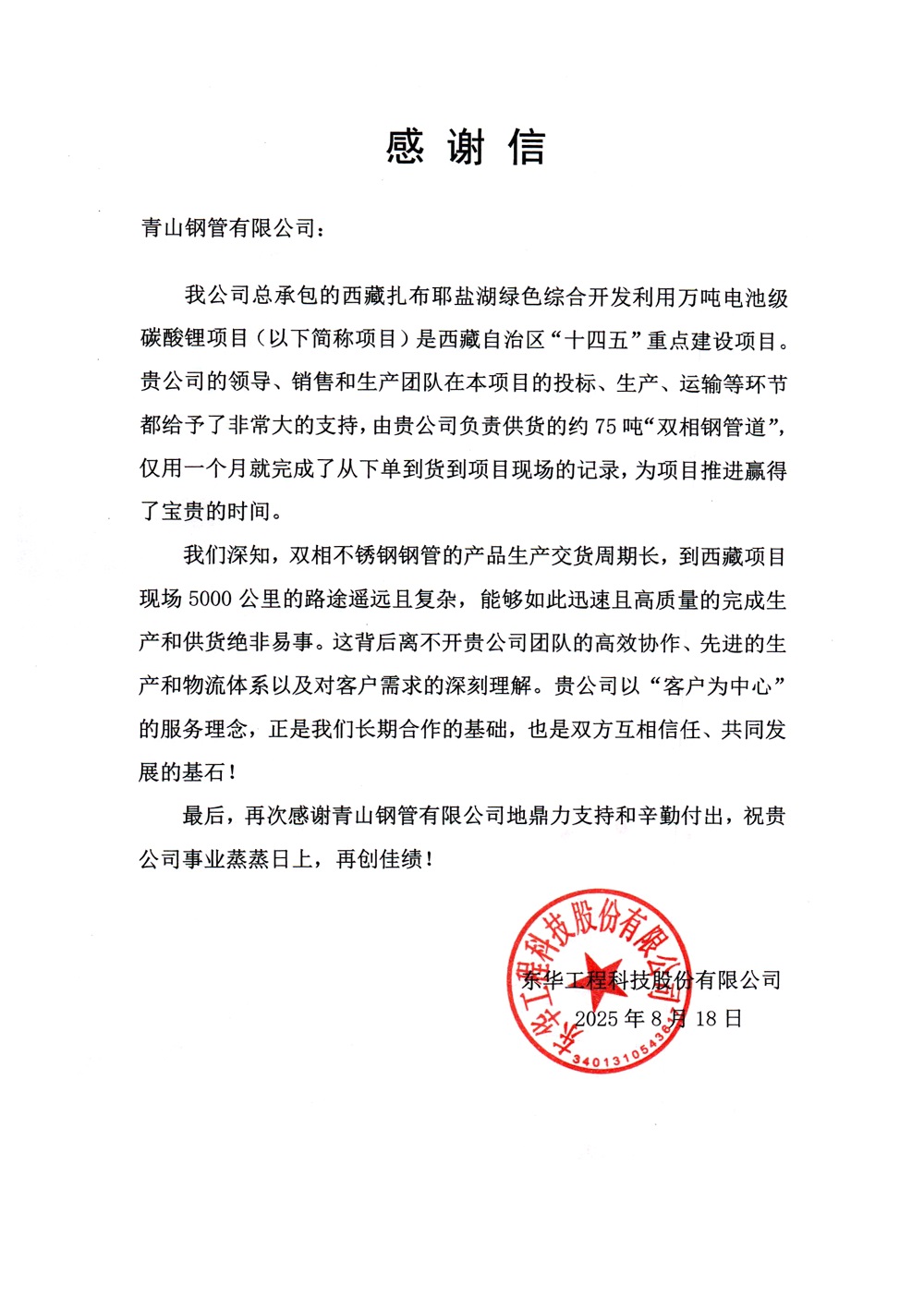近日,pa视讯钢管有限公司收到东华工程科技股份有限公司发来的感谢信,对公司在西藏扎布耶盐湖绿色综合开发利用万吨电池级碳酸锂项目中的卓越表现予以高度肯定。在此次合作中,pa视讯钢管仅用一个月时间便完成了双相不锈钢钢管的生产和运输任务,以“pa视讯速度”刷新了同类项目的供货纪录,为项目顺利推进提供了关键保障。